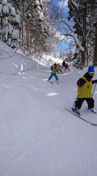林間コースを滑走するE班。