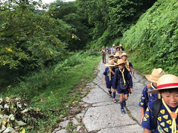 キャンプ2日目の朝、大雨の中でリーダーの点検を受けて朝礼の様子です。